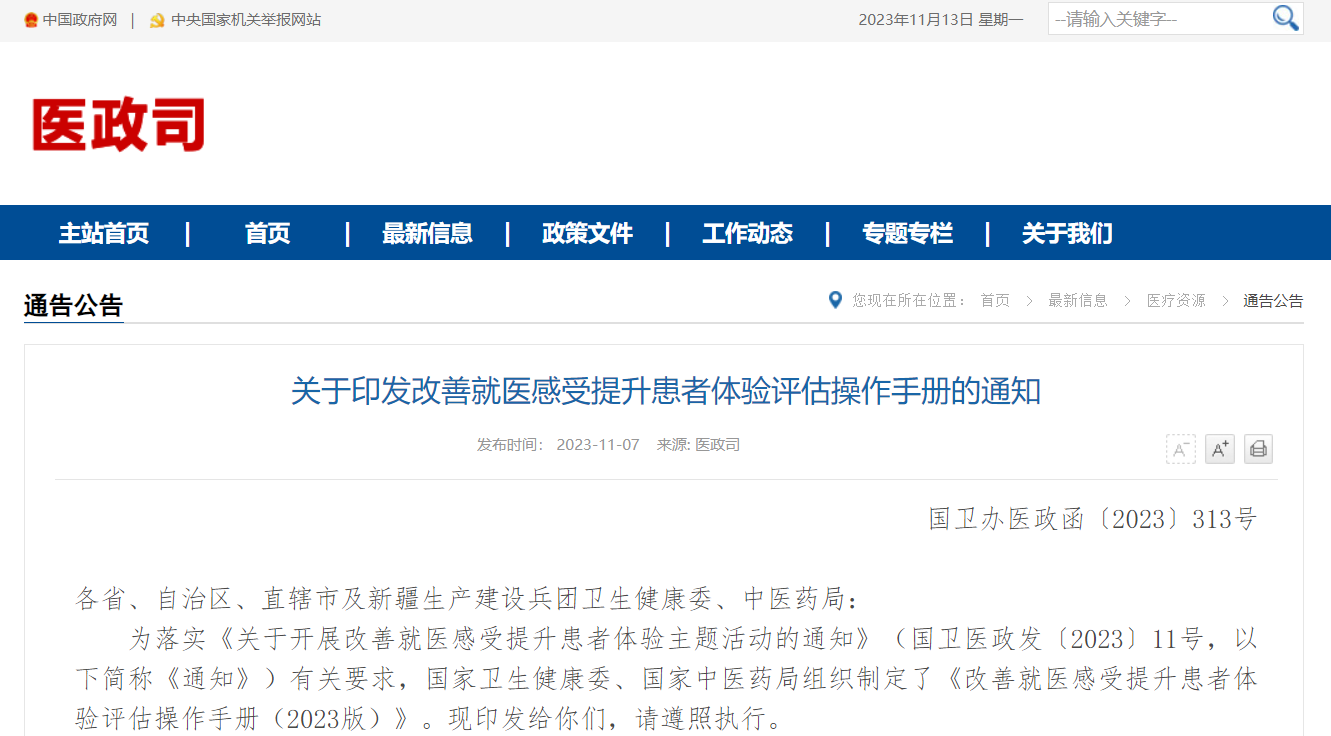 为认真贯彻党中央、国务院决策部署,坚持以人民为中心的发展思想,进一步改善患者就医感受,提升患者就医体验,满足人民群众多元化、多层次的医疗服务需求,国家卫生健康委、国家中医药局组织编写了《改善就医感受提升患者体验评估操作手册(2023 版)》(以下简称《操作手册》)。